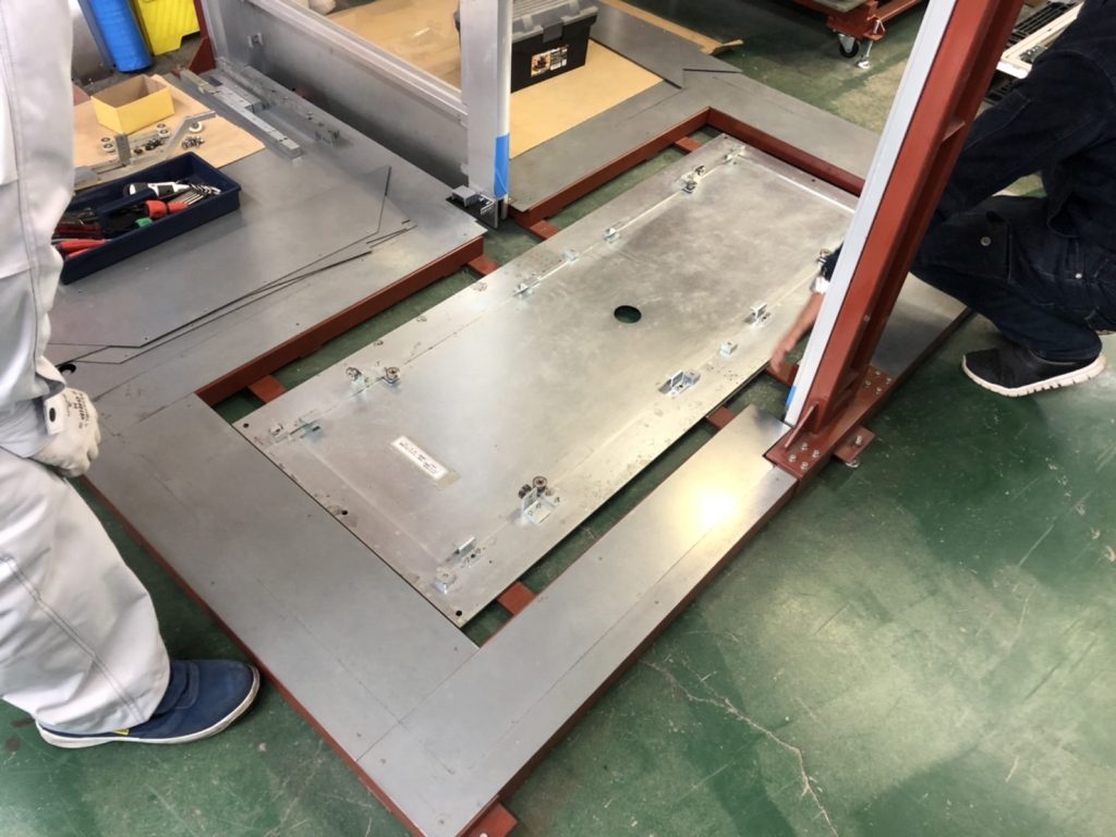 □吊りドアが自重で閉じるのを、下部点検口に取付けられた重りが手助けしています(駆動部をもちあげてドアを閉めています)